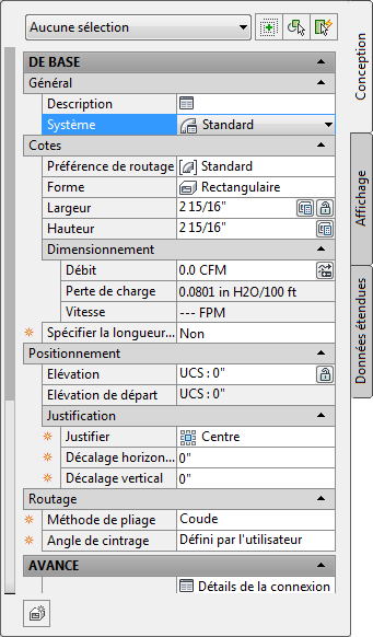 | *Débit | Le débit est obtenu des pièces à vues multiples raccordées à la conduite de gaine ou il peut être saisi. | 0 (par défaut). Le débit sera automatiquement mis à jour si la gaine est connectée à une pièce à vues multiples. |