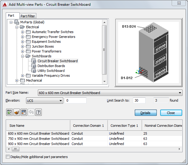 - Cliquez sur Détails pour afficher les tailles disponibles pour le sous-type de composant sélectionné.