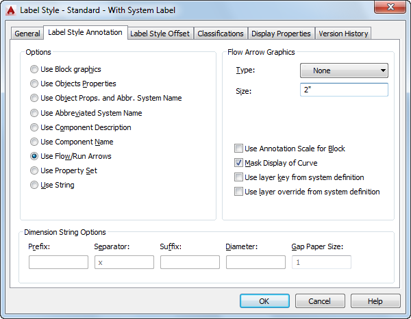 Permet de spécifier les indicateurs de direction du flux dans les conduites. Ces indicateurs s'affichent sous forme de blocs. Vous pouvez choisir le type de bloc à afficher. Si vous souhaitez utiliser un style personnalisé d'indicateur de direction du flux dans les conduites, sélectionnez Utiliser un indicateur dans le type d'indicateur de direction du flux dans les conduites, puis sélectionnez le style souhaité dans la boîte de dialogue Sélectionner un bloc de flèche personnalisé. Si vous souhaitez faire varier l'échelle de l'indicateur en fonction de l'échelle d'annotation, sélectionnez l'option Utiliser l'échelle d'annotation pour le bloc. Remarque : C'est ce paramètre, et non la propriété Annotation de la définition du bloc sélectionné, qui permet de déterminer si le style d'étiquette est annotatif ou non. Pour plus d'informations, reportez-vous à la rubrique Mise à l'échelle des annotations.
