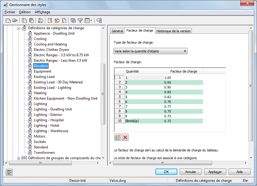 Chaque facteur de charge est associé à une valeur multipliée par la charge pour déterminer la demande d'une catégorie de charge. Il est important de définir une demande de charge de manière à éviter toute surcharge du circuit. La définition d'un facteur de charge permet également d'obtenir un réel calcul de la demande de charge estimée.