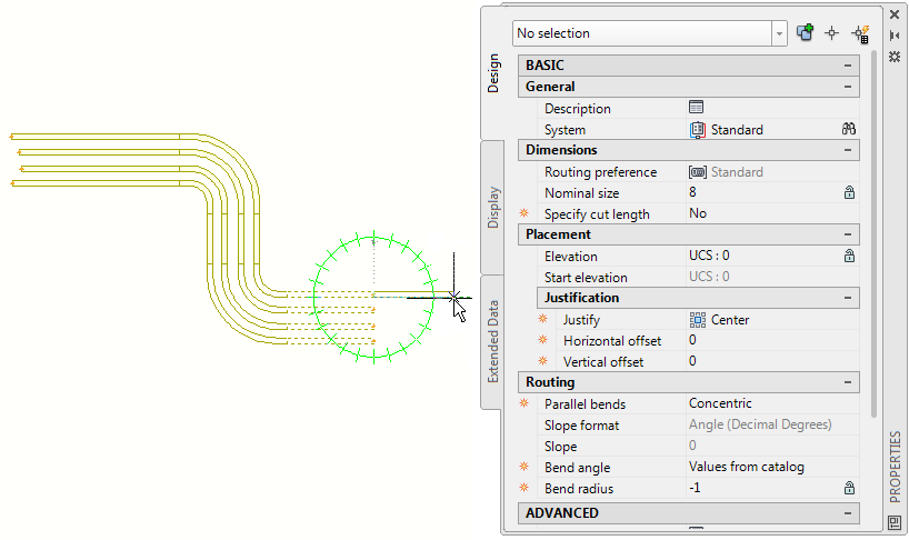 Concentrique applique le rayon de cintrage uniquement au tube IRO de ligne de base. AutoCAD MEP calcule automatiquement les valeurs correctes de rayon interne, central et extérieur pour s'assurer que tous les rayons suivent les normes de 16", 24", 32" et 40", pour chaque cintrage de tube IRO.
