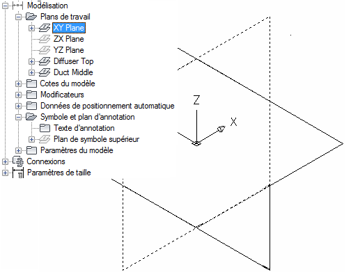 Cette procédure permet d'ajouter des plans de travail dans lesquels vous générez la géométrie de votre modèle. Pour plus de clarté, ne travaillez qu'avec un seul plan dans la mesure où vous n'utilisez pas de plans de travail de décalage et de référence. Notez que vous avez la possibilité d'ajouter des plans de travail au fur et à mesure que vous en avez besoin pour générer le modèle. Les plans de travail de décalage sont particulièrement utiles pour repérer les différentes parties d'un composant comme les deux côtés d'un régulateur d'air. Quant aux plans de travail de référence, ils permettent de localiser la géométrie de vos composants (les débouchures d'une boîte de dérivation ou les robinets d'un réservoir, par exemple).