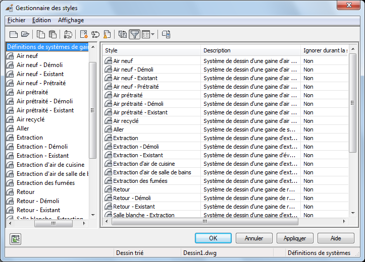 Les systèmes sont chargés par le biais de gabarits AutoCAD MEP. Si vous n'utilisez pas de gabarit AutoCAD MEP, vous pouvez importer des définitions de système à partir d'autres dessins à l'aide du gestionnaire des styles. Vous trouverez des définitions de système supplémentaires dans le fichier System Definitions.dwg, lequel se trouve dans le dossier suivant : \ProgramData\Autodesk\MEP 2014\fra\Styles.