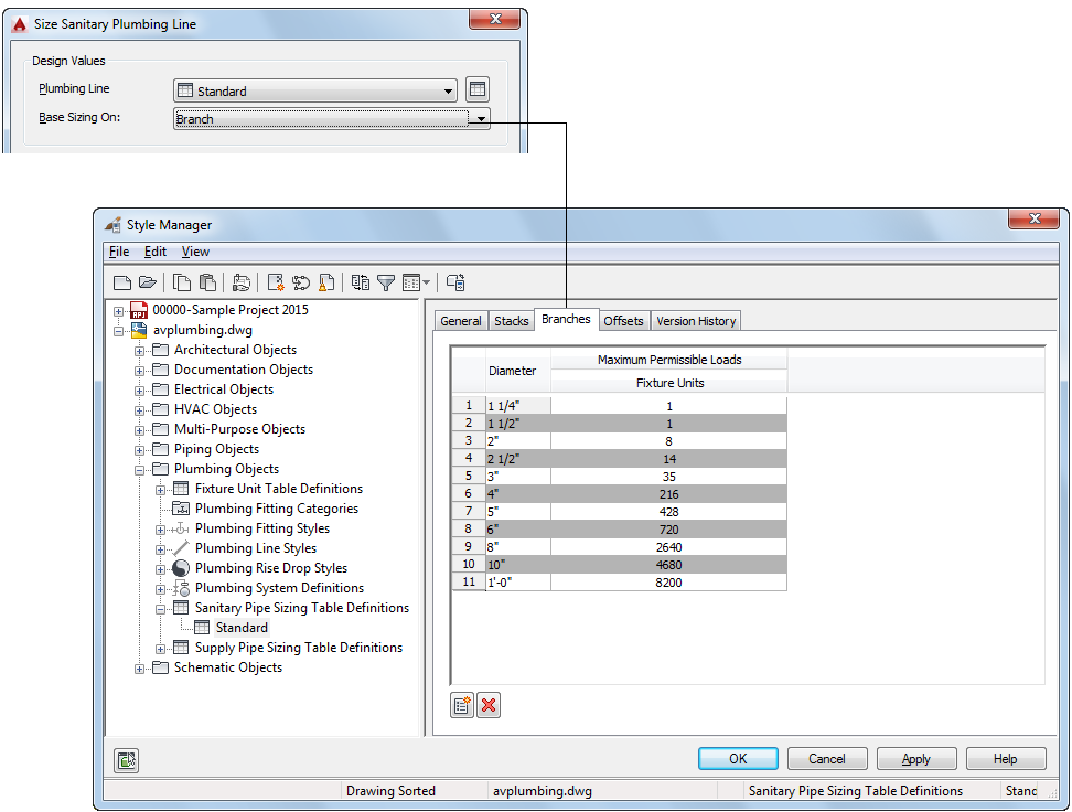 Lorsque vous définissez la conduite sanitaire en tant que branche, le logiciel effectue le calcul de dimensionnement à l'aide des informations de l'onglet Branches de la table de dimensionnement de ligne de plomberie sanitaire (table de dimensionnement des canalisations), dont les définitions se trouvent dans le gestionnaire des styles.