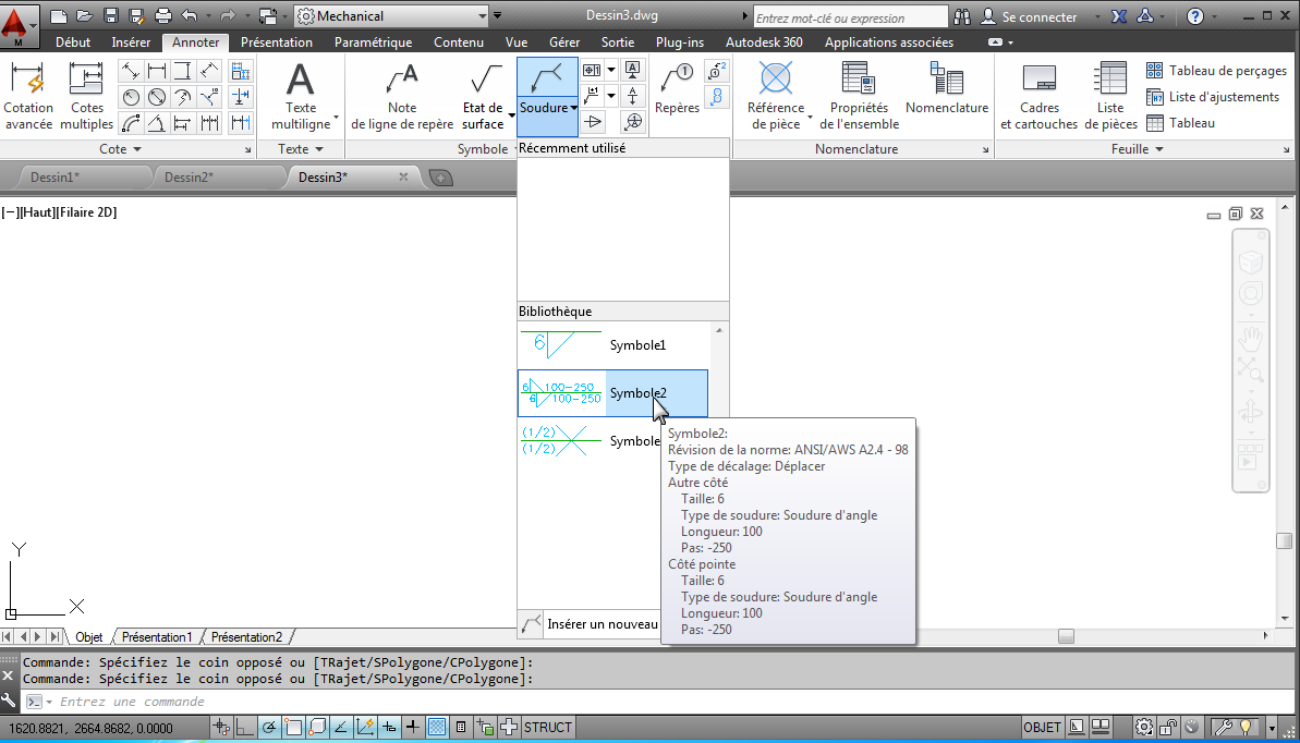 Le plus souvent, vous pouvez insérer des symboles de la bibliothèque de symboles directement à partir du ruban. Etant donné que ces symboles sont entièrement configurés, AutoCAD Mechanical n'affiche pas de boîte de dialogue lorsque vous les placez dans le dessin. Cette fonctionnalité vous fait gagner un temps précieux lors de l'insertion de symboles fréquemment utilisés.