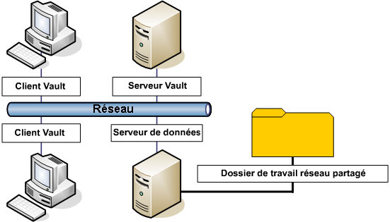 Lorsque les dossiers de travail sont stockés sur des ordinateurs locaux, comme illustré à la figure 7, le trafic du réseau est réduit et les membres de l'équipe peuvent travailler hors ligne de l'extérieur ou à partir d'un bureau à domicile. Les utilisateurs génèrent du trafic sur le réseau uniquement lorsqu'ils archivent ou extraient des fichiers du coffre-fort.