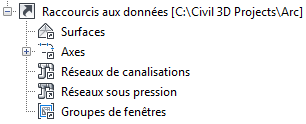 Les raccourcis aux données ne peuvent être créés que pour les surfaces, les axes, les lignes de profil en long, les réseaux de canalisations, les réseaux sous pression et les groupes de fenêtres. Ils créent des liens de référence entre les dessins sans utiliser de base de données. Lorsque vous créez des raccourcis aux données à partir d'un dessin, ils apparaissent dans le noeud Raccourcis aux données de l'arborescence du prospecteur. Depuis cet emplacement, vous pouvez insérer un objet de référence dans un autre dessin ouvert en cliquant avec le bouton droit de la souris sur son raccourci.