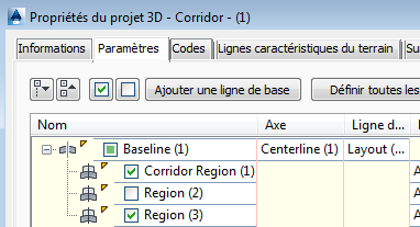La boîte de dialogue Propriétés du projet 3D vous permet de cibler des polylignes et des figures de topographie, ainsi que des axes et des lignes de profil en long. Pour accéder aux propriétés d'un projet 3D, cliquez sur celui-ci avec le bouton droit de la souris et sélectionnez Propriétés du projet 3D. Cette boîte de dialogue est présentée ci-après à la figure 32.