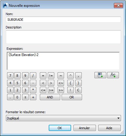 Une fois créée, cette expression peut être utilisée comme composant des styles d'étiquette et des styles de table. Il vous suffit de créer un style d'étiquette de surface nommé Point coté utilisant l'expression SUBGRADE. Utilisez la boîte de dialogue Nouvelle expression, comme illustré à la figure 10.