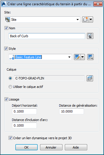 La boîte de dialogue Créer une ligne caractéristique du terrain à partir du projet 3D permet de créer un site et de spécifier le nom et le style de la ligne caractéristique du terrain.