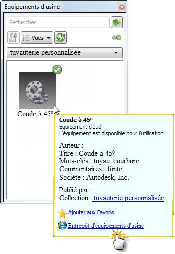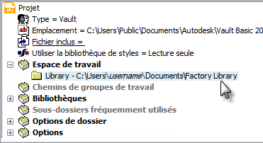 Tout nouvel équipement d'usine que vous créez et publiez peut désormais être ajouté directement au dossier Bibliothèque. Pour plus d'informations sur les projets Inventor, reportez-vous à la rubrique A propos des projets dans l'aide d'Inventor ou en ligne sur http://wikihelp.autodesk.com/Inventor/fra/2014.