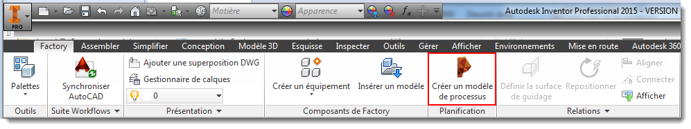 Vous pouvez lancer Process Analysis 360 en cliquant sur le bouton Créer un modèle de processus situé dans la barre d'outils d'Inventor Factory.