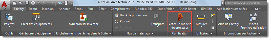 Dans AutoCAD Factory, lancez Process Analysis 360 en cliquant sur le bouton Créer un modèle de processus situé dans la barre d'outils.
