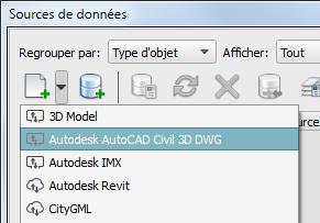 Remarque : L'ajout de données Civil 3D dans un modèle à l'aide d'un fichier DWG nécessite d'avoir installé AutoCAD Civil 3D localement sur votre ordinateur ou votre réseau. Vous pouvez également ajouter des données provenant d'un fichier IMX créé à partir du fichier DWG. Reportez-vous à la rubrique