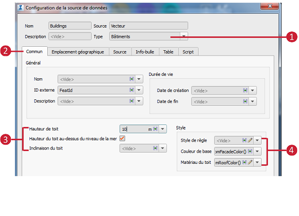 - Spécifiez des propriétés de style spécifiques au type de données supplémentaires, telles que la couleur de base de la façade du bâtiment et le matériau du toit.