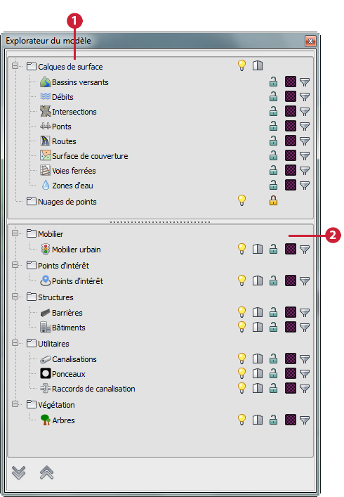 Masquez ou affichez les sources de données dans le modèle. Lorsque l'image de l'ampoule est jaune, la source de données est affichée ; lorsqu'elle est blanche, la source de données est masquée. Les objets qui s'appliquent directement sur le terrain (terrain, couverture, eau, voies ferrées et routes) sont considérés comme des calques de surface. Le contrôle Afficher/Masquer permet de gérer l'affichage de ces objets en tant que groupe. Pour les masquer ou les afficher séparément, cliquez avec le bouton droit de la souris sur Calques de modèle de surface et choisissez Gérer les calques de surface. Remarque : Cette fonctionnalité est également disponible dans le groupe de fonctions Sources de données.