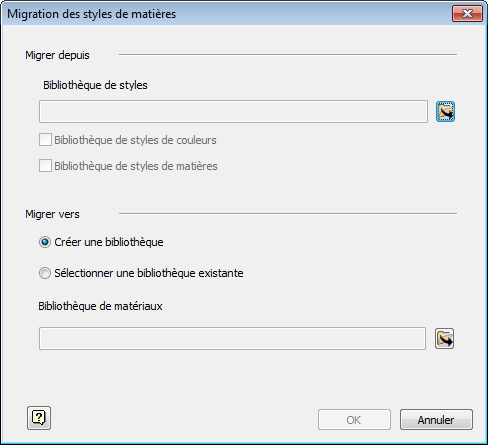 Inventor 2013 a ajouté d'autres bibliothèques de matières et d'apparences à la place des styles de matières et de couleurs. D'autres bibliothèques et d'autres contenus sont fournis. Toutefois, si vous préférez utiliser une bibliothèque appartenant à une version précédente, vous pouvez la migrer en suivant les étapes décrites ci-après.