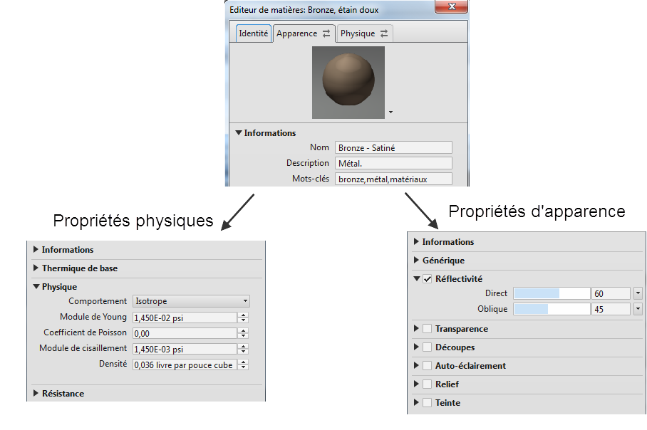La figure présente certaines propriétés physiques et d'apparence d'une matière Bronze, Etain, comme affiché dans l'éditeur de matières. Les propriétés physiques sont regroupées dans une ressource de la matière, et les propriétés d'apparence dans une autre. Lorsque vous modifiez une matière, vous pouvez modifier chaque ressource de manière indépendante. Par exemple, vous pouvez modifier la matière en bronze pour qu'elle soit rouge. Remplacez la ressource d'apparence par Aluminium - Anodisé rouge, une ressource dotée de propriétés d'apparence différentes.