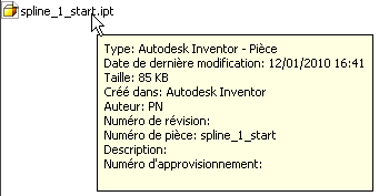 Lorsque vous placez le curseur sur un nom de fichier Inventor, une info-bulle affiche les propriétés de ce fichier.