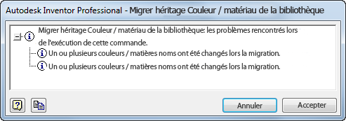 Pour plus d'informations, reportez-vous à la rubrique Migration des styles de couleur et matière Inventor hérités dans l'aide d'Autodesk Inventor.