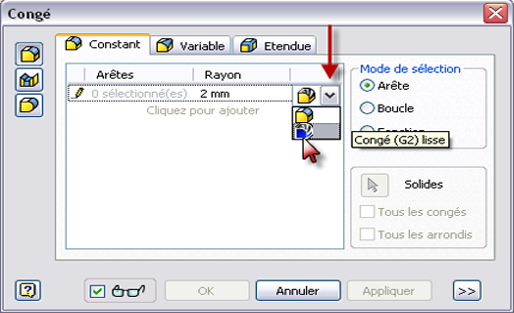 - Dans la boîte de dialogue Congé, réglez le rayon sur 2 mm.