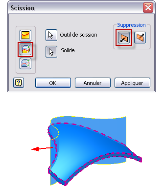 - Sélectionnez l'option Découpe de solide; Sélectionner la surface comme Outil de scission. Assurez-vous que le côté à supprimer soit orienté dans la direction opposée de la matière.