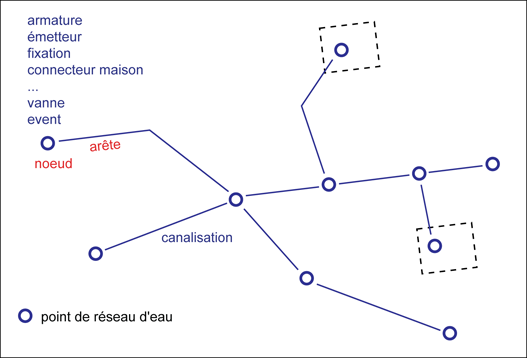 Topologie de réseau d'eau. Les points du réseau sont connectés aux lignes. Ils ne doivent pas figurer sur une ligne du réseau.