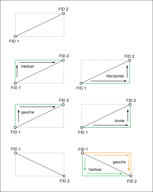 Le sens des lignes entre deux points provient du FID. Par exemple, il est possible de créer une ligne à partir du FID 1 vers le FID 2, soit verticalement, soit horizontalement, en dessinant la ligne à gauche ou à droite de l'objet réel.
