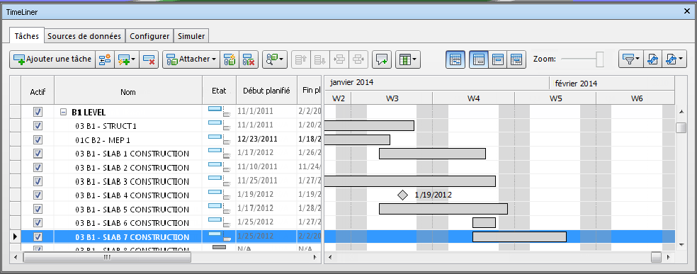 Autodesk Navisworks TimeLiner prend en charge une structure de tâche hiérarchique importée à partir d'une source de données, par exemple Microsoft Project™ (voir Onglet Sources de données pour plus d'informations). La hiérarchie peut être développée ou comprimée par un simple clic sur le signe plus ou moins en regard de la tâche.