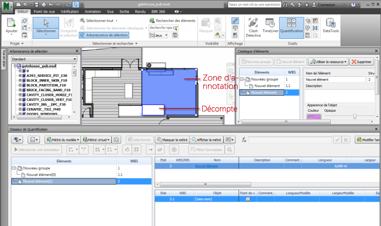 Découpez des éléments géométriques à l'aide de la fonction de décompte. En dessinant un décompte, vous excluez un élément de métré de surface existant. Les décomptes sont utiles lorsque, par exemple, vous avez annoté une surface au sol, mais que vous souhaitez exclure une section de cette surface, telle qu'un couloir, du métré. La surface de décompte est ainsi extraite de la surface au sol dans le classeur de quantification.