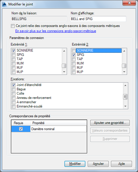 - Dans la section Configuration du projet, cliquez sur Paramètres de connexion des tuyauteries pour afficher la boîte de dialogue Configuration de liaison.