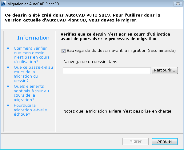 Lorsque vous tentez d'ajouter un dessin créé dans une version antérieure à un projet créé dans la version actuelle, l'assistant de migration de dessin s'ouvre. La migration porte uniquement sur le dessin que vous ajoutez au projet. Vous pouvez créer une copie de sauvegarde au cours de la migration, au cas où le dessin devrait être retravaillé dans la version antérieure. Si vous annulez la migration, le dessin revient à son état d'origine.