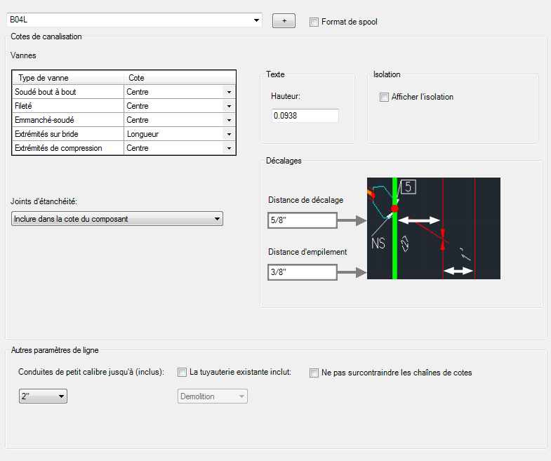 Répertorie les types de vannes/robinets pour lesquels vous pouvez spécifier un style de cote. Pour chaque type de vanne/robinet, vous pouvez spécifier Longueur globale et Centre.