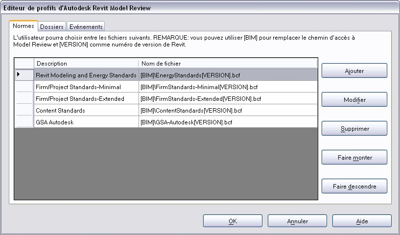 Dans cette fenêtre, vous pouvez ajouter des vérifications existantes (*.bcf), modifiez des descriptions (appellation conviviale) et/ou l'ordre d'affichage. Ces profils enregistrés s'affichent tels quels dans les listes prédéfinies des menus déroulants Vérification et Gérer. Cette configuration est enregistrée dans le fichier Model Review .config, sous le dossier d'installation. Pour permettre à plusieurs personnes d'utiliser cette configuration, vous devez copier ce fichier dans le dossier d'installation de chaque utilisateur.