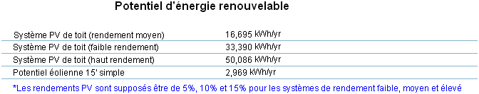 Lors de la consultation d'une analyse d'énergie dans la boîte de dialogue Résultats et comparaison, ce tableau résume la quantité d'électricité que le site du bâtiment peut produire à l'aide de panneaux solaires et d'éoliennes.