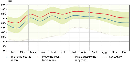 L'humidité pouvant varier énormément tout au long de la journée (elle est généralement plus élevée le matin), le graphique affiche la moyenne du matin et la moyenne de l'après-midi.