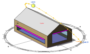 Utilisez l'outil Trajectoire du soleil de Revit ou la boîte de dialogue Paramètres d'ombre et de soleil pour étudier la proposition de profondeur d'ombre pour toutes les orientations au Solstice d'été, au Solstice d'hiver, à l'Equinoxe d'automne et à l'Equinoxe de printemps.