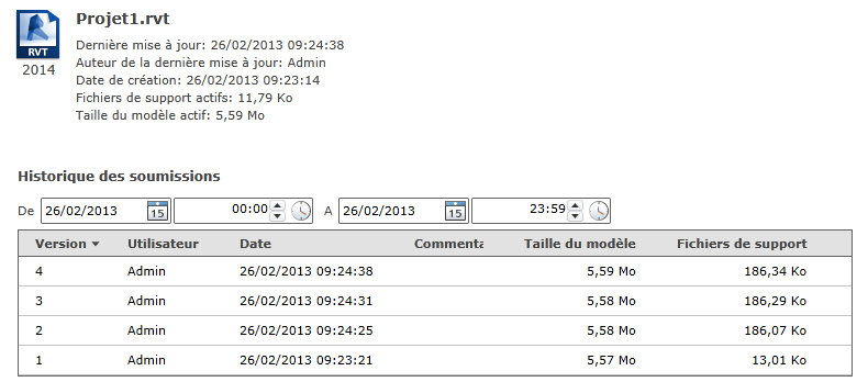 Lorsque vous sélectionnez un modèle dans le contrôle d'arborescence, le volet droit affiche l'historique des modifications soumises, ainsi que les éventuels commentaires des membres de l'équipe, comme illustré ci-dessous. Utilisez le filtre de date pour afficher les événements qui se sont produits à une période spécifique.
