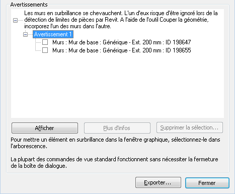 Développez la liste pour consulter les éléments associés à chaque avertissement. Lorsque vous sélectionnez le texte situé en regard d'un avertissement, l'élément est mis en surbrillance dans toutes les vues ouvertes où il est visible.