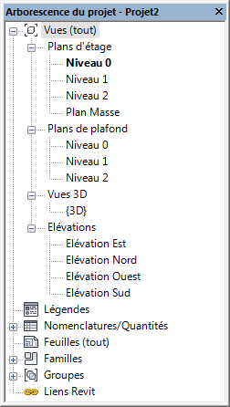 L'arborescence du projet correspond à une hiérarchie logique de l'intégralité des vues, nomenclatures, feuilles, groupes et autres parties du projet actif. A mesure que vous développez l'arborescence, les éléments du niveau inférieur s'affichent.