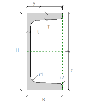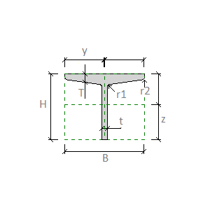 B. : Largeur : largeur externe de la forme de coupe. H. Hauteur : hauteur externe de la forme de coupe. T. Epaisseur de l'aile : distance entre les surfaces extérieures de l'aile dans la forme de la coupe. t. Epaisseur de l'âme : distance entre les surfaces extérieures de l'âme dans la forme de coupe. r. Congé de l'âme : rayon du congé entre l'âme et l'aile. y. Centre de gravité horizontal : distance entre le centre de gravité de la forme de coupe et les extrémités de gauche le long de l'axe horizontal. z . Centre de gravité vertical : distance entre le centre de gravité de la forme de coupe et les extrémités inférieures le long de l'axe vertical. alpha. Angle des axes principaux : angle de rotation entre les axes principaux et les plans de référence de la coupe. Cette option est répertoriée en tant que paramètre de famille Analyse structurelle. |