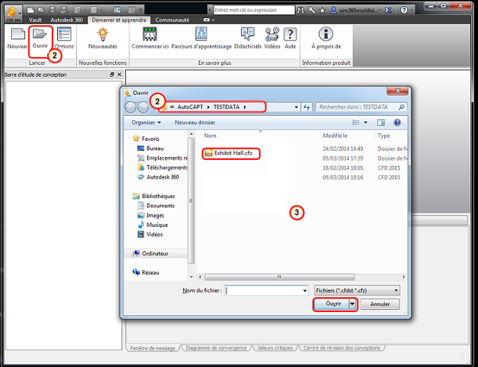 2. Dans le panneau Lancer, cliquez sur Ouvrir, puis sélectionnez C:\ProgramData\Autodesk\Simulation CFD <version>\Tutorials\Exhibit hall.
