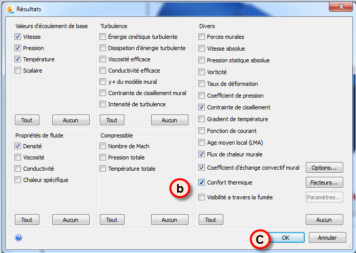 - b. Dans la boîte de dialogue Quantités de résultats, sélectionnez Confort thermique.