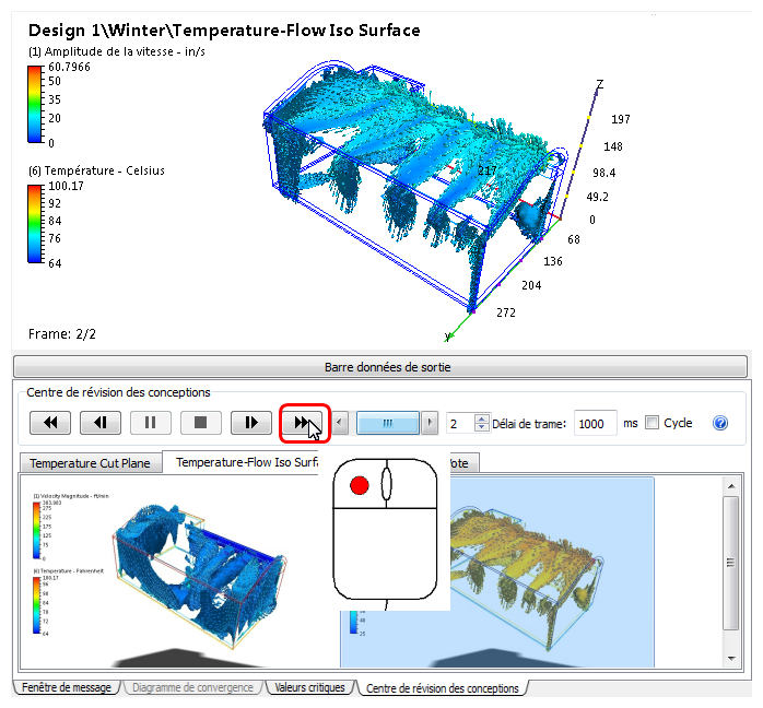 Dans l'étape précédente, vous avons regardé la température au milieu du hall et nous avons observé des différences importantes entre les scénarios d'hiver et d'été. Dans cette étape, nous allons utiliser l'image récapitulative d'une isosurface pour mieux comprendre l'interaction entre l'écoulement et la température.