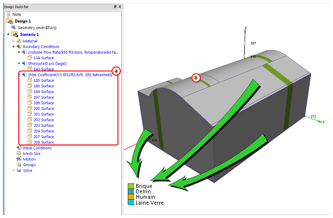 15. Pour vérifier que la condition aux limites du coefficient de transmission superficielle est correctement appliquée à la surface extérieure, vérifiez la barre Etude de conception et la bande de couleur sur les surfaces :