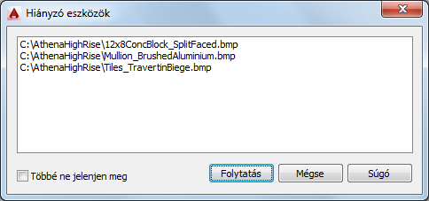 Ez a párbeszédpanel az olyan jelenetek renderelésekor jelenik meg, amelyek textúratérképeinek az elérési útvonala már nem érvényes. Ez akkor fordulhat elő, ha a textúratérképeket áthelyezték vagy törölték, vagy ha a rajzfájl lett áthelyezve egy eltérő meghajtótársításokkal rendelkező számítógépre.
