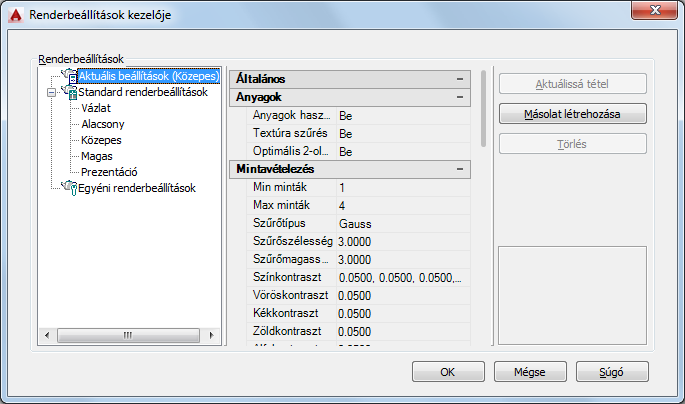Az aktuális rajzhoz tárolt összes renderelési alapbeállítás fa nézetét jeleníti meg. Két típusú renderbeállítás létezik: Szabványos és felhasználói.