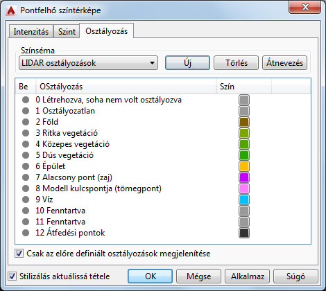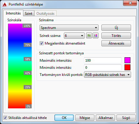 Az intenzitás és szintmagasság stilizálások esetében szerkesztheti egy színséma színsávját vagy átmenetskáláját, és megváltoztathatja a minimum/maximum tartományértékeket, amelyekre a színskála érvényes. Az osztályozás stilizálás esetében a megjelenítendő színeket az egyes osztályozási kategóriákhoz rendelheti.