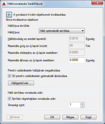 A Hálóvonalazási beállítások párbeszédpanelen megadott alapértékek a 3D háló objektumokká átalakítandó objektumok megjelenését szabályozza. A hálóvá átalakítható objektumok teljes listája a HÁLÓSIMÍT parancs ismertetésénél található.