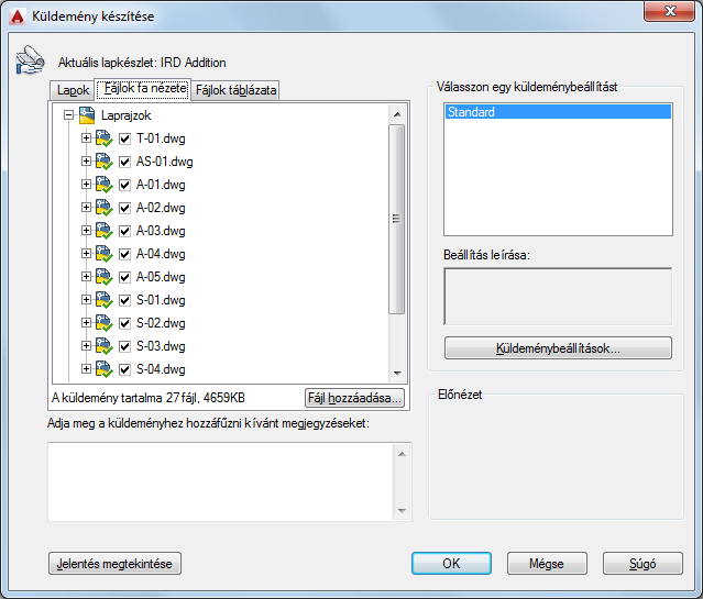 Jelentésinformációt jelenít meg, amely belekerül a küldeménycsomagba. Magában foglal minden beírt küldemény-megjegyzést, és tartalmazza azokat a program által automatikusan létrehozott disztribúciós megjegyzéseket, amelyek részletezik, hogy milyen lépések szükségesek a küldeménycsomag tökéletes működéséhez. Ha például SHX betűtípusok találhatók egy küldött rajzban, megjelenik egy útmutató arról, hova kell másolnia ezeket a fájlokat ahhoz, hogy azok a küldeményt telepítő számítógépen észlelhetők legyenek. Ha készült alapértelmezett megjegyzéseket tartalmazó szövegfájl, akkor a jelentés ezeket is tartalmazza.